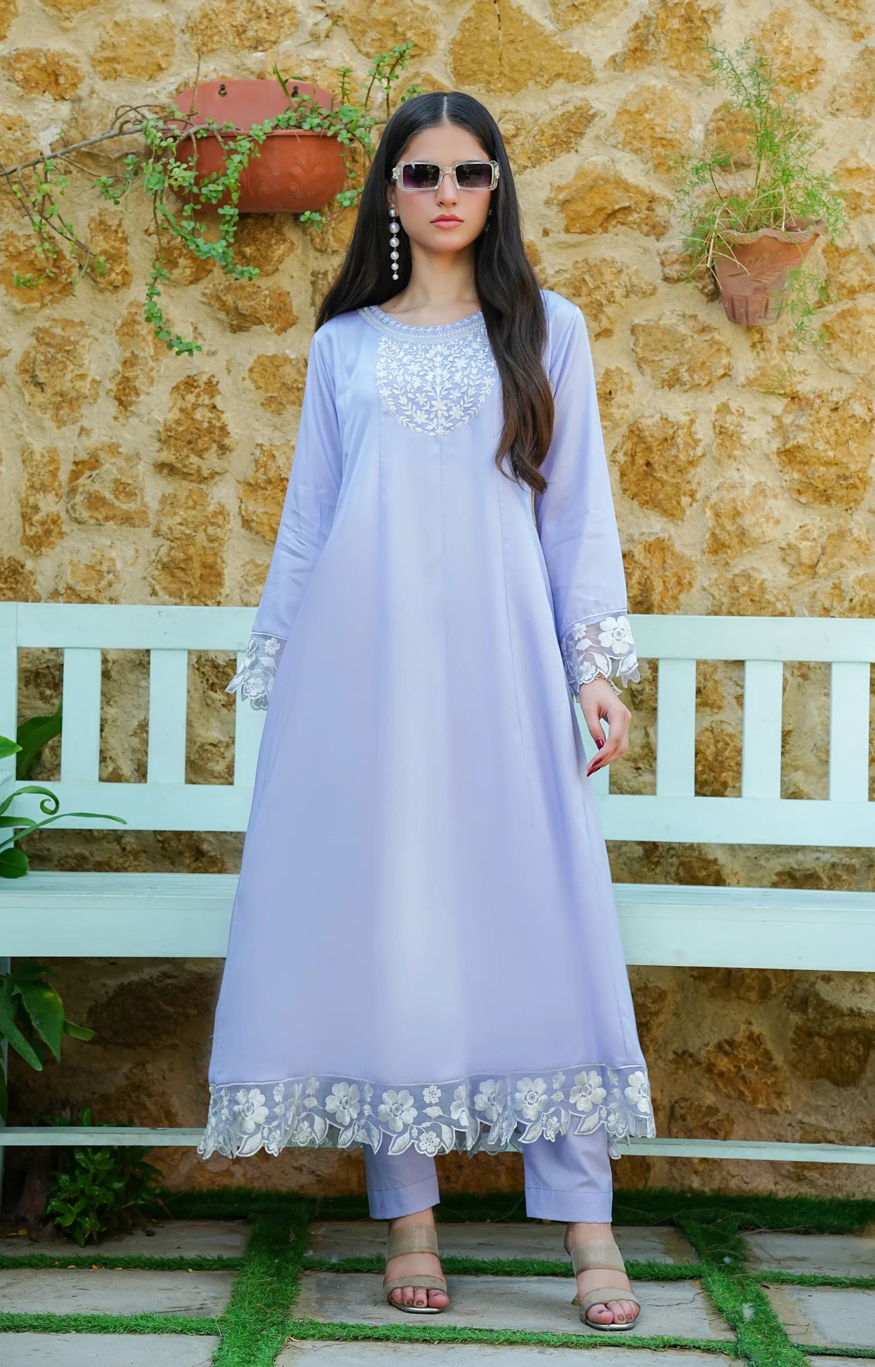 Emanate timeless elegance with Liana, a mesmerizing embroidered cotton silk ensemble designed for effortless sophistication. The flowing silhouette, adorned with delicate floral cutwork at the hem and sleeves, exudes grace and charm. The soft lilac hue enhances its ethereal appeal, making it a perfect choice for refined gatherings and festive occasions. This two-piece stitched outfit blends comfort with luxury, ensuring you stand out with understated glamour.