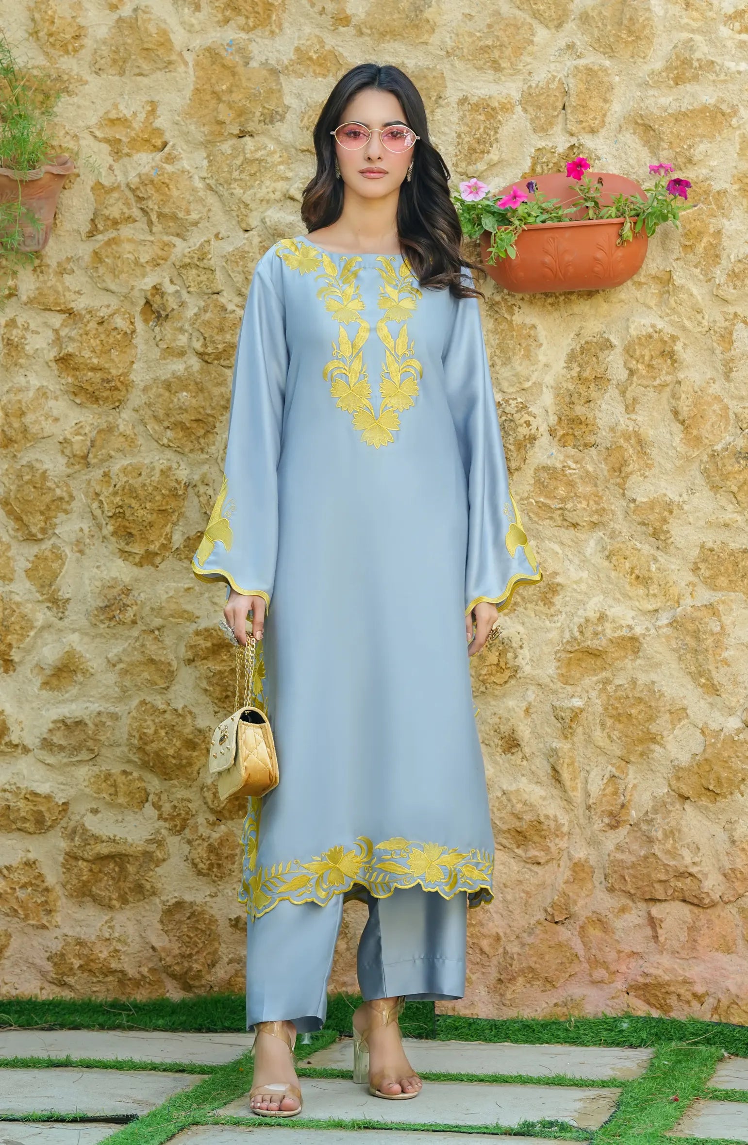 Elevate your elegance with Sufia, a refined embroidered cotton silk ensemble that blends sophistication with modern charm. The soft blue fabric is adorned with intricate golden embroidery, adding a regal touch to the look. Flowing sleeves with delicate cutwork and a gracefully finished hemline enhance its luxurious appeal. Paired with matching trousers, this two-piece stitched outfit is perfect for making a statement at festive gatherings and evening soirées.